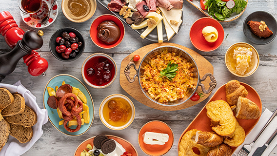 Kalem Börek, Patates Kızartması, Su böreği, Sosis, Sucuk, Göz yumurta, Köz biber, Domates, Yeşillik, Ceviz ve Çay